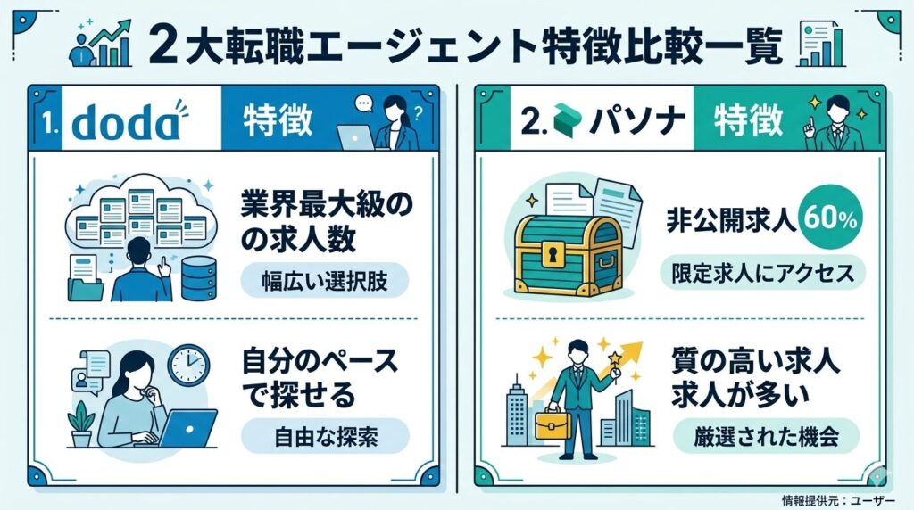dodaで幅広く求人を見ながら、パソナで質の高い非公開求人を探す。この2つを併用するのが最もバランスの良い転職活動の進め方です。